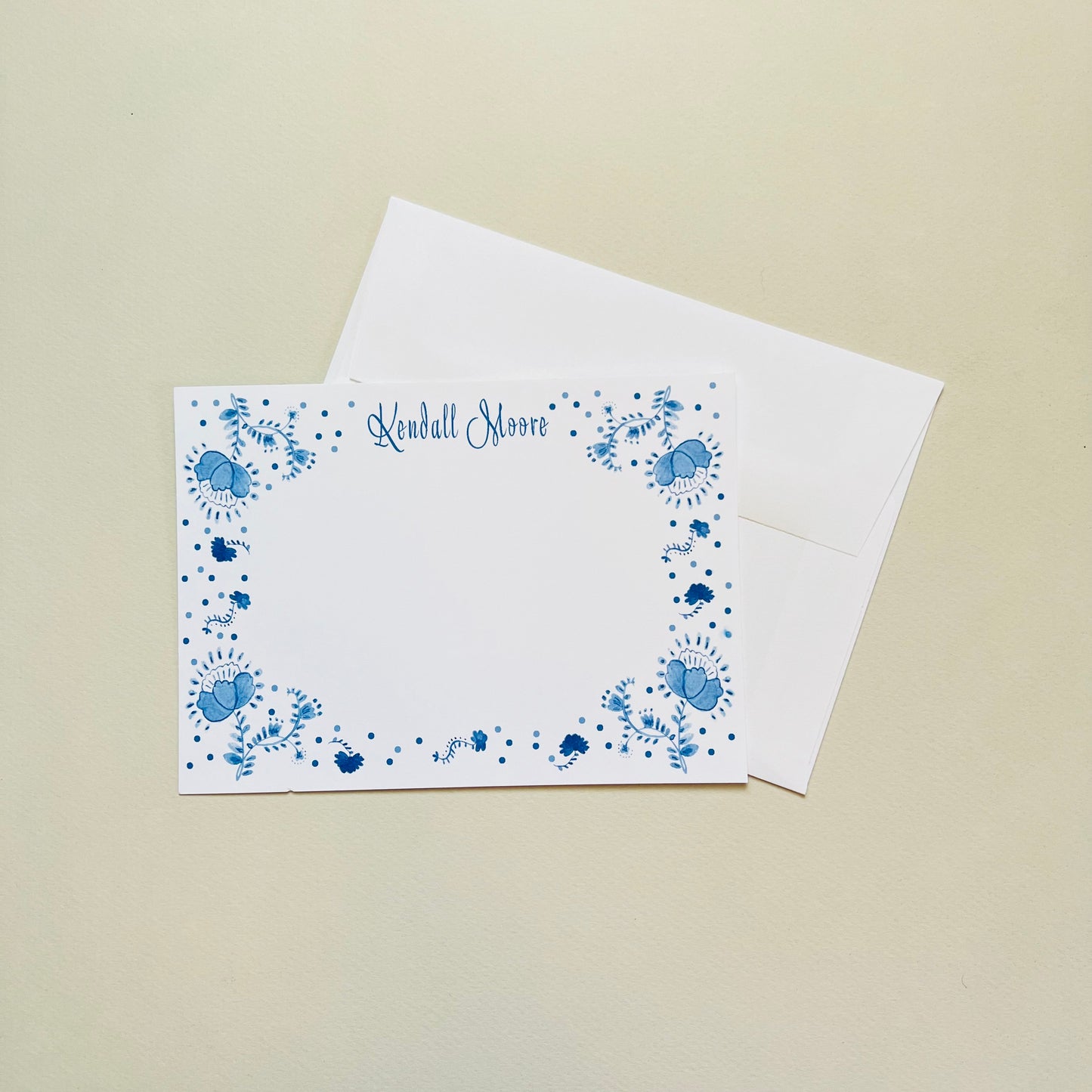 Our Blue Floral Correspondence Card is a custom watercolor design by Pearl Paperie. It measures 6.25” x 4.5” and includes a matching white envelope. All orders are flat printed on 120 lb eggshell white stock. Font and ink color will be printed as shown.