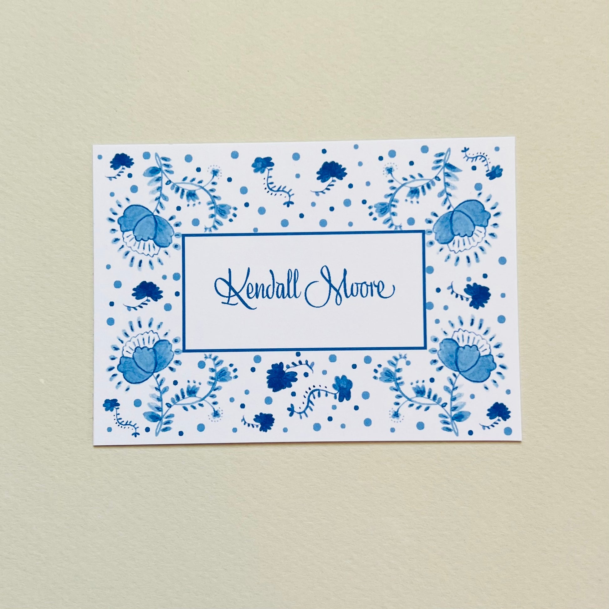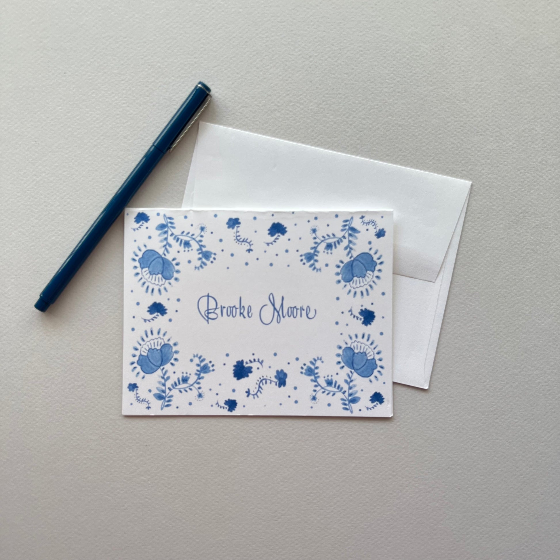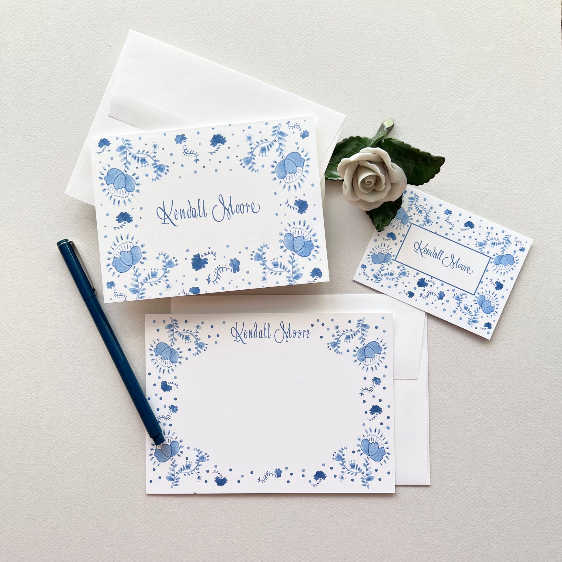 Our Blue Floral watercolor design makes a great stationery set. This set includes 10 Foldover Notes with envelopes, 10 Correspondence Cards with envelopes and 12 Gift Enclosure Cards all in the same design with the same personalization. Folded Notes measure 5.5" x 4.25", Correspondence Cards measure 6.25" x 4.5", and Gift Enclosure Cards measure 3.75" x 2.75" All items are flat printed on 120 lb eggshell white stock.
