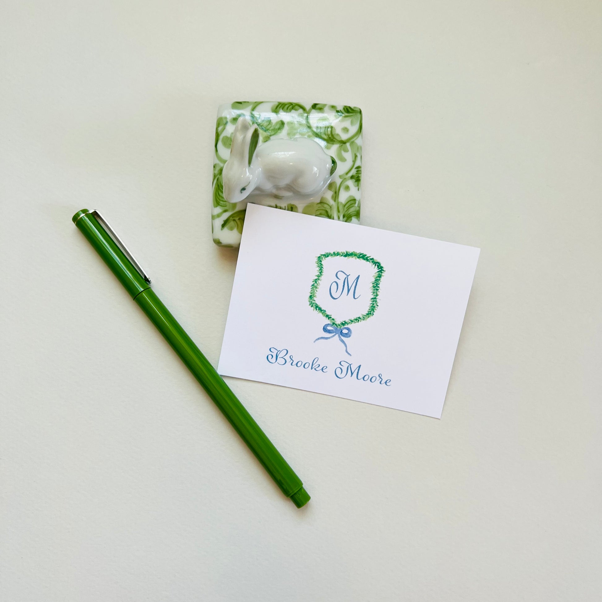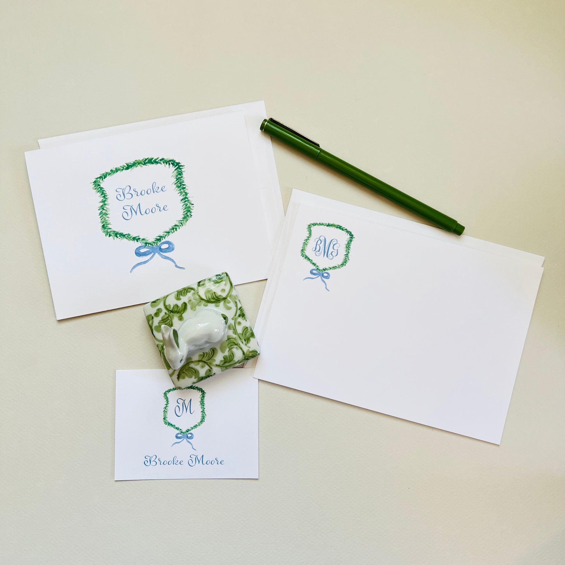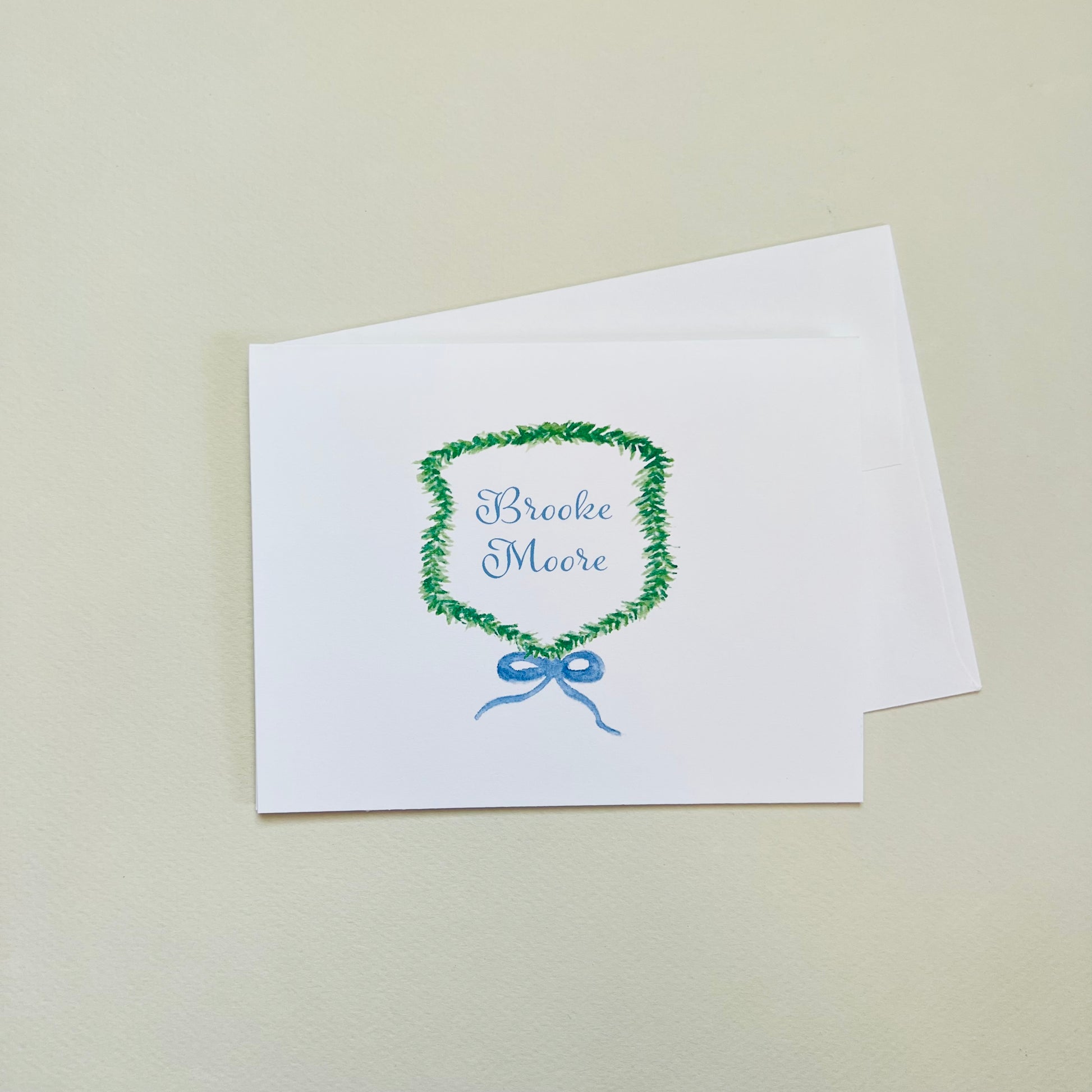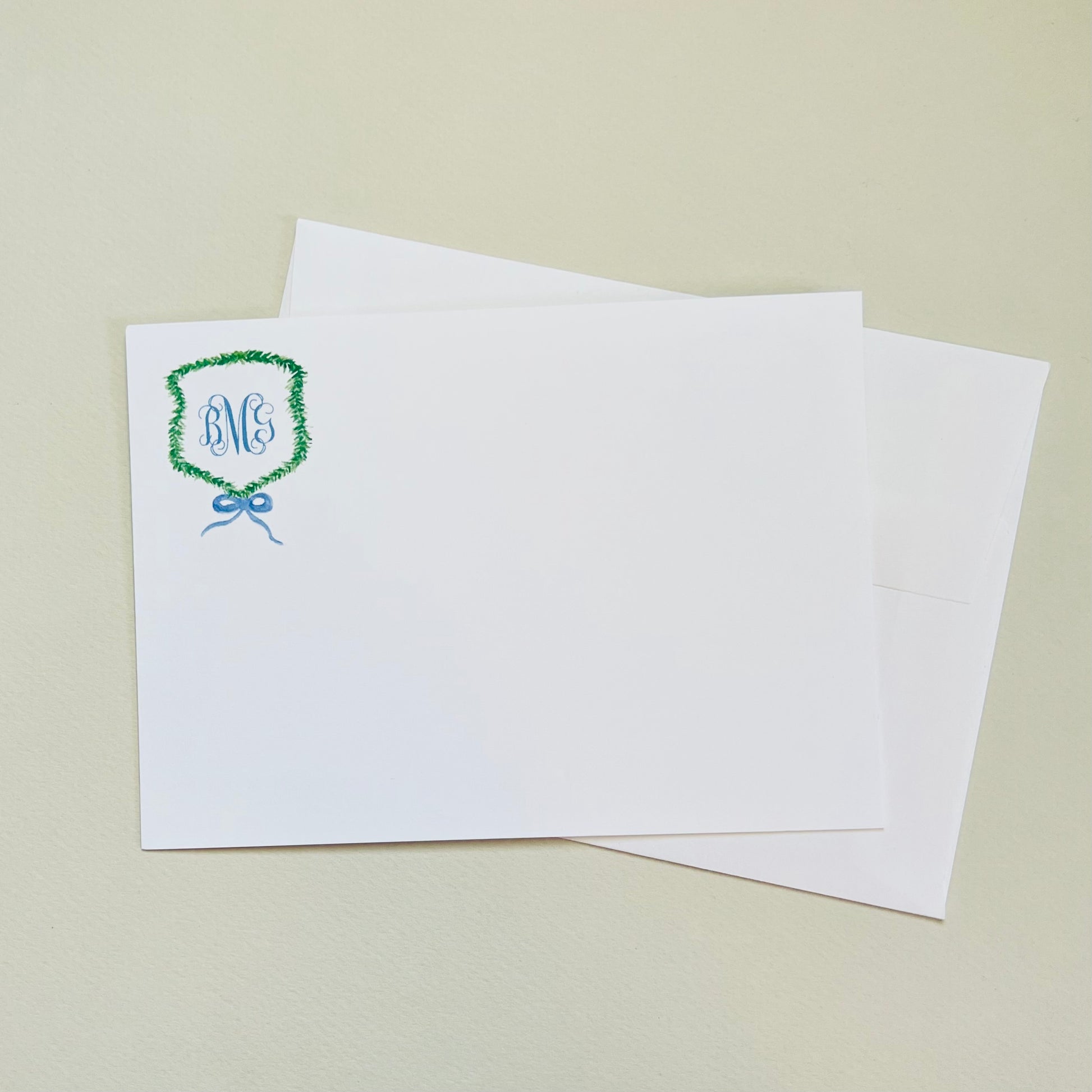 Our Green Garland with a Blue Bow design makes a great stationery set. This set includes 10 Foldover Notes with envelopes, 10 Correspondence Cards with envelopes and 12 Gift Enclosure Cards all in the same design with the same personalization. All items are flat printed on 120 lb eggshell white stock. Folded notes measure 5.5” x 4.25”, Correspondence cards measure 6.25” x 4.5” and Gift Enclosure cards measure 3.75” x 2.75”