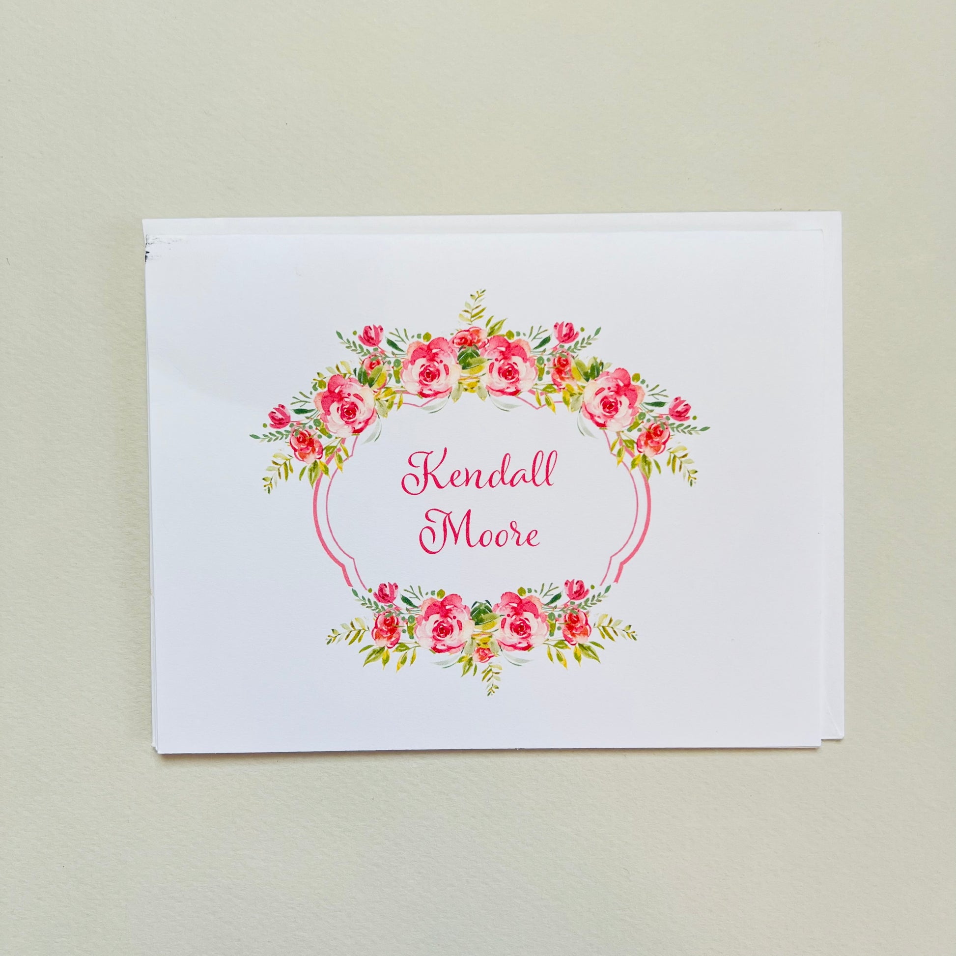 Our Love Garland design makes a great stationery set. This set includes 10 Foldover Notes with envelopes, 10 Correspondence Cards with envelopes and 12 Gift Enclosure Cards all in the same design with the same personalization. All items are flat printed on 120 lb eggshell white stock in the font and ink color shown. Foldover notes measure 5.5” x 4.25”, Correspondence cards measure 6.25” x 4.5” and Gift enclosure cards measure 3.75” x 2.75”