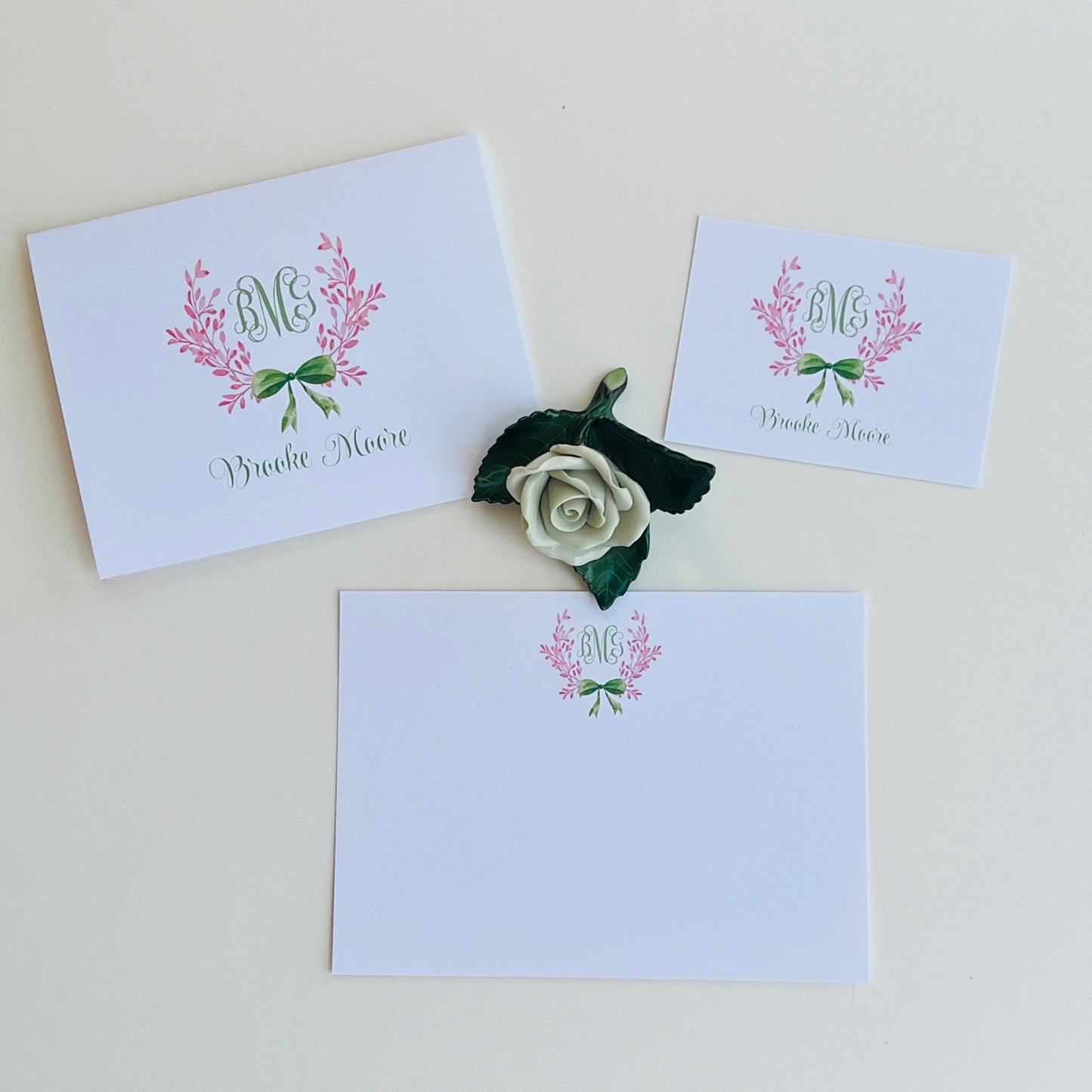 Our Pink Crest with Green Bow watercolor design makes a great stationery set. This set includes 10 Foldover Notes with envelopes, 10 Correspondence Cards with envelopes and 12 Gift Enclosure Cards all in the same design with the same personalization. Folded Notes measure 5.5" x 4.25", Correspondence Cards measure 6.25" x 4.5", and Gift Enclosure Cards measure 3.75" x 2.75" All items are flat printed on 120 lb eggshell white stock.